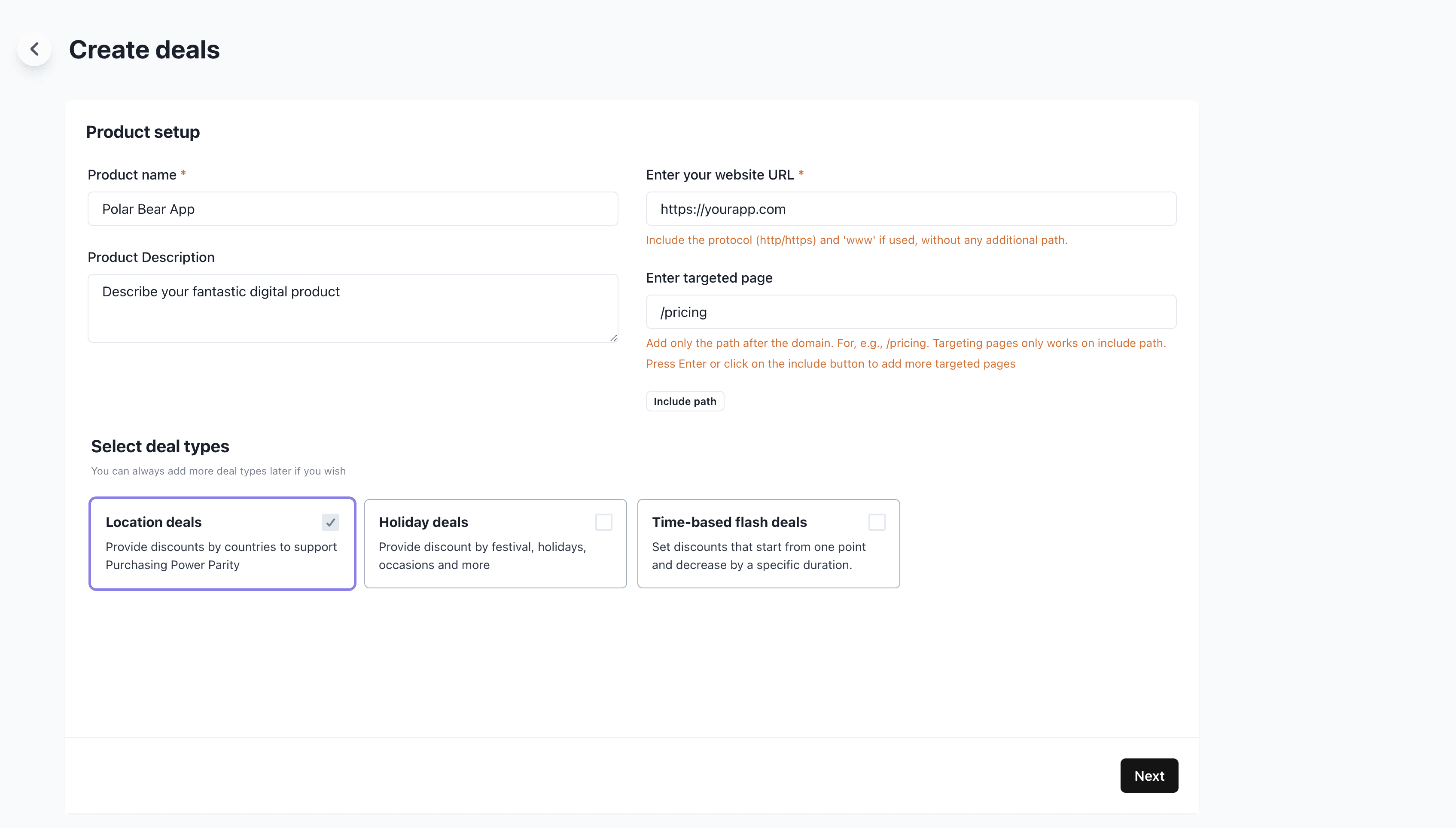 Let’s configure our deal settings.- Enter your website URL (requires your own site vs. Polar storefront)