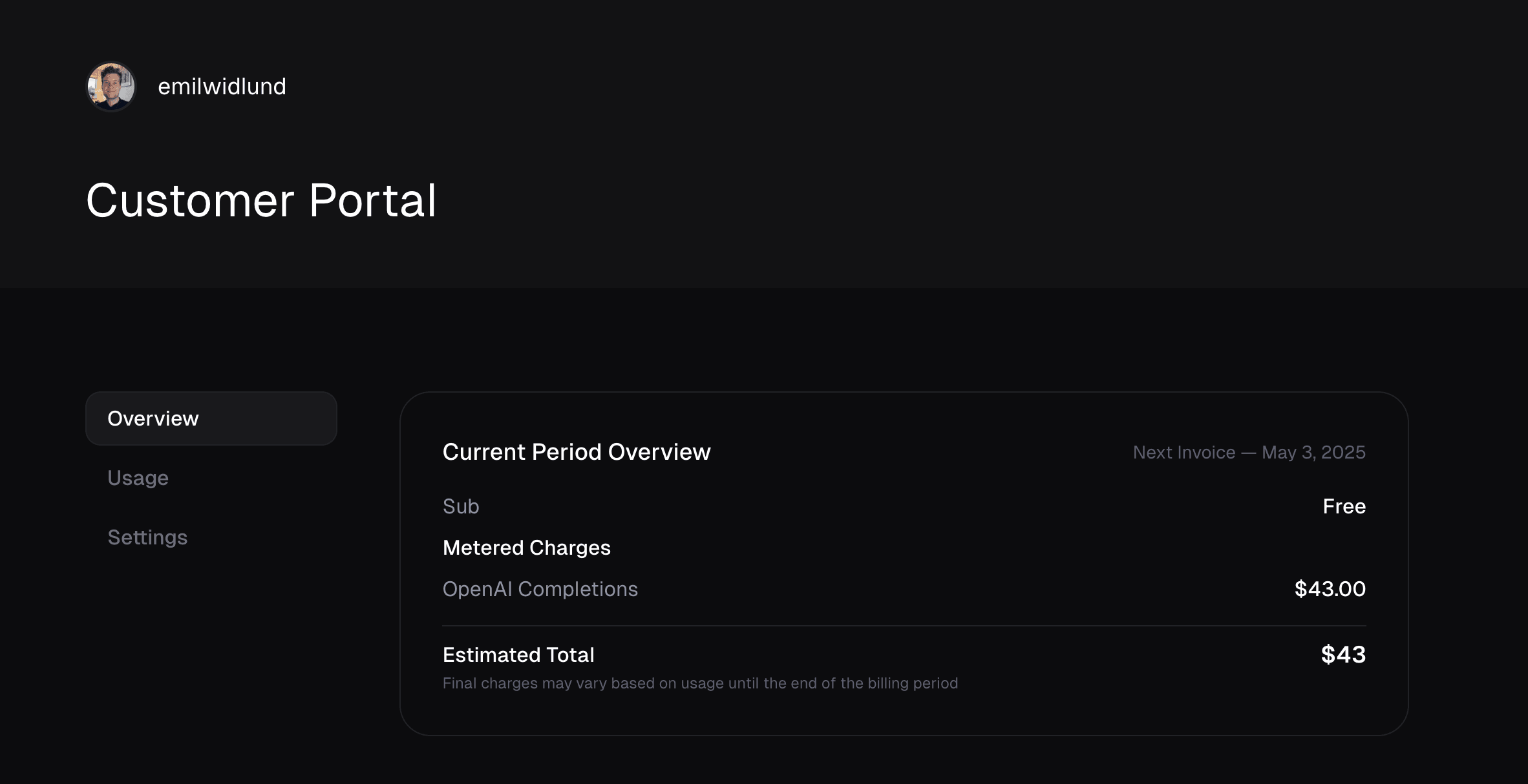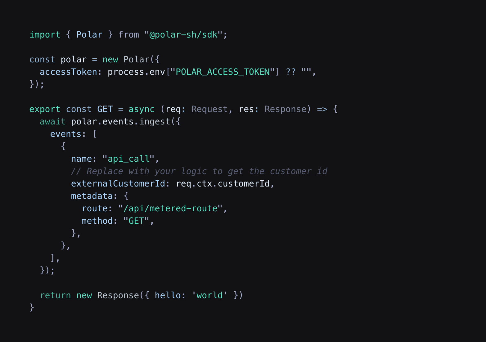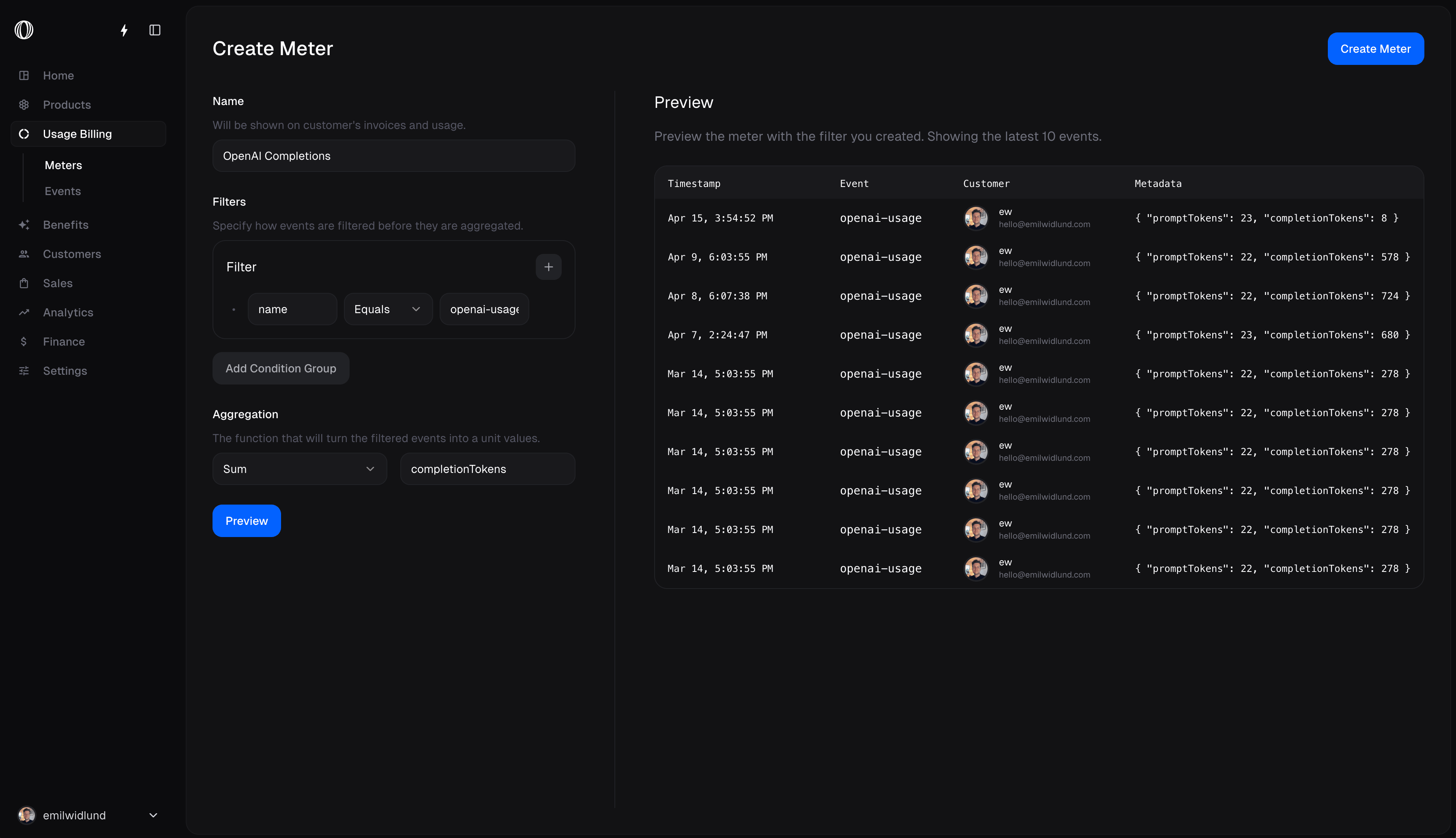Now you’re ready to ingest events from your application. Sending events which match the meter’s filter will increment the meter’s usage for the customer.
